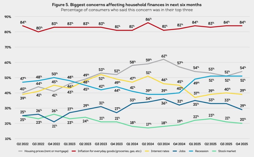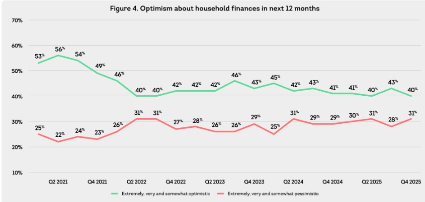 Canadians say they’re doing fine, but they’re still bracing for the worst. Nearly two-thirds of households felt their finances performed as expected or better in Q4 2025. At the same time, just 40% were optimistic about their finances over the next 12 months, down 3 points from the prior quarter. That’s tied for the lowest reading in the past five years, last seen when the trade war kicked off in Q2 2025, and again in 2022 when rates began to climb .